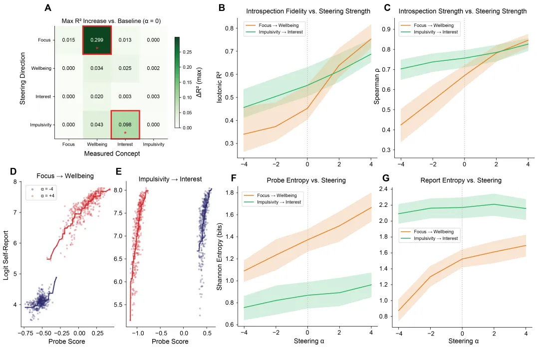 四个情感概念中,幸福感和兴趣的内省效果最好,专注度次之。而冲动性,在 8B 模型上完全失效,激活引导的方向和预期相反。研究者推高”冲动性”方向的激活,模型的冲动性自我评分反而下降了。