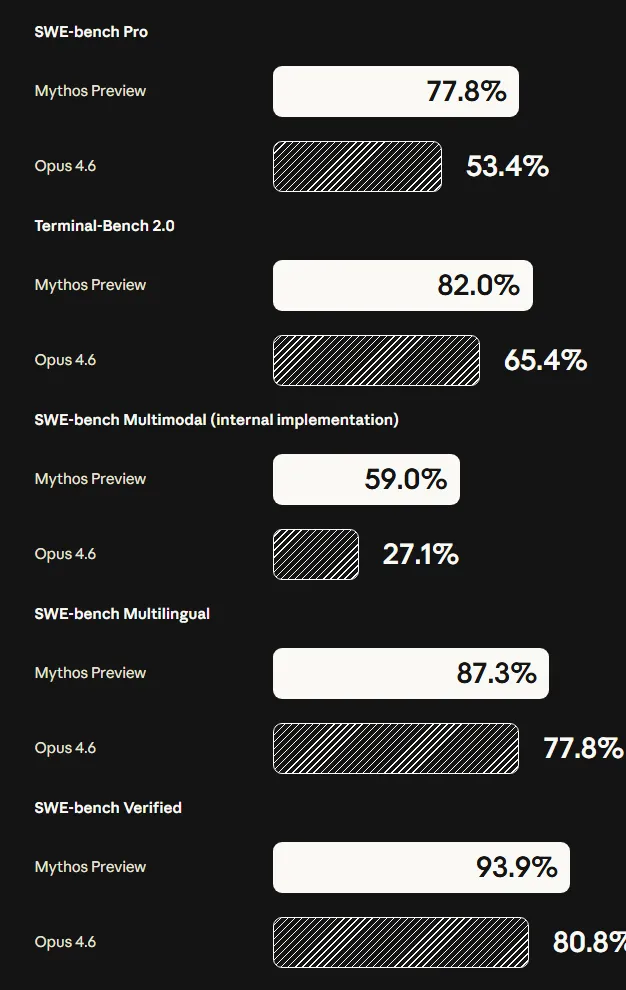 在多模态SWE-bench内部测试中,两者的差距更为悬殊:Mythos得分59.0%,而Opus 4.6仅有27.1%。