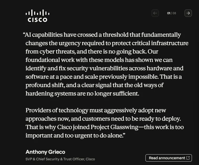 在硬件层面,英伟达、博通等公司的参与意味着安全风险正向底层硬件渗透。思科高级副总裁安东尼·格里科(Anthony Grieco)指出,过去加固系统的方法已经失效,Mythos正在以前所未有的速度扫描硬件漏洞,这种深刻的转变没有回头路可走。