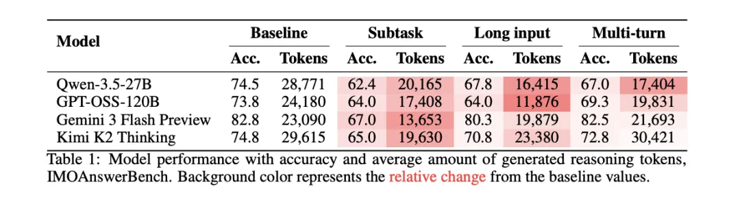 结果:Qwen-3.5-27B 基线准确率 74.5%,平均推理 28771 个 Token。塞进莎士比亚后,准确率跌到 67.8%,推理 Token 暴缩到 16415,少了 43%。GPT-OSS-120B 更夸张,推理量从 24180 直接腰斩到 11876。四个模型在所有非基线条件下,推理 Token 都在系统性缩水,最高逼近 50%。