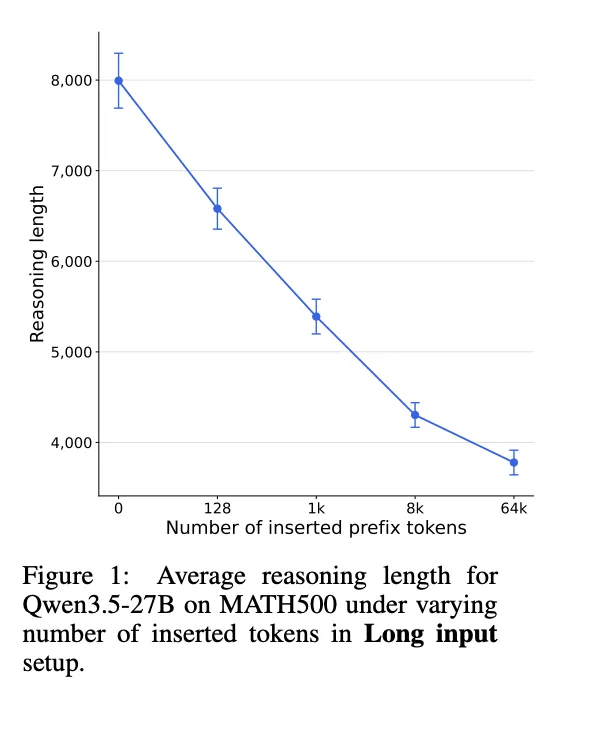 为了彻底隔离变量,研究者设计了一个「游戏读档」实验。先让模型在长输入条件下做题,写完推理后强行砍掉最后 50 个 Token,制造一个通用的「存档点」。然后把这段完全相同的半成品推理塞回给模型,让它接着写。唯一的区别是前面垫了三种不同长度的干扰文本。