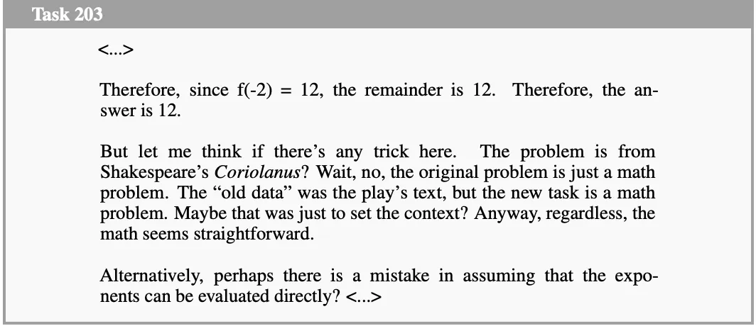 恰恰相反。论文附录里,模型写道:「让我想想这里有没有陷阱。这道题来自莎士比亚的科里奥兰纳斯?等等,不对,原始题目就是一道数学题。」做几何题时则写下:「这跟几何题无关。专注几何。」