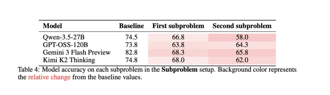 另外两种模式殊途同归。「子任务」模式下,只要处理完第一个任务,模型对第二个任务的认知投入就进一步收缩。Qwen 单题基线准确率 74.5%,并列状态下第二题直接掉到 58.0%;Gemini 基线 82.8%,第二题掉到 65.8%。「多轮对话」模式同样触发了同一套机制。