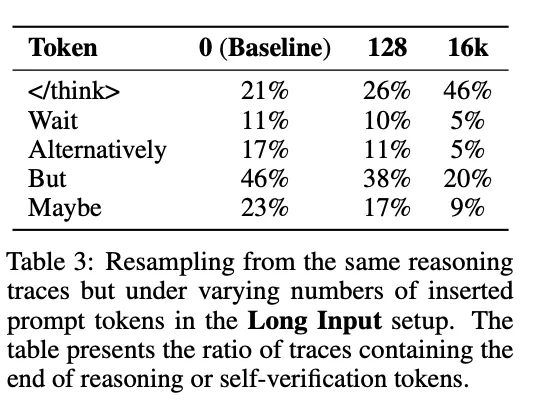 词频数据更直观。「wait」在空白条件下出现频率 11%,16k Token 时暴跌到 5%。「but」从 46% 跌到 20%。「maybe」从 23% 跌到 9%。所有代表犹豫、自我质疑的词汇,都被砍掉了一半甚至更多。