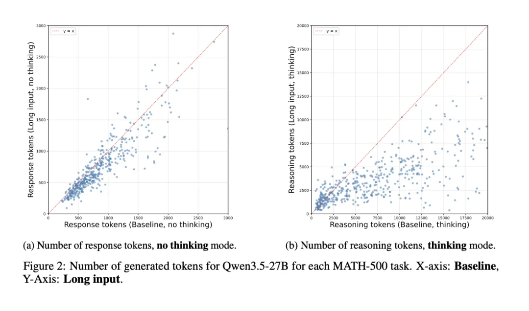 研究者在 500 道数学题上,逐帧记录了模型在基线与长输入两种条件下第一次写出候选答案的位置。基线条件下平均 925 个 Token,长输入条件下 939 个 Token。几乎分毫不差。
