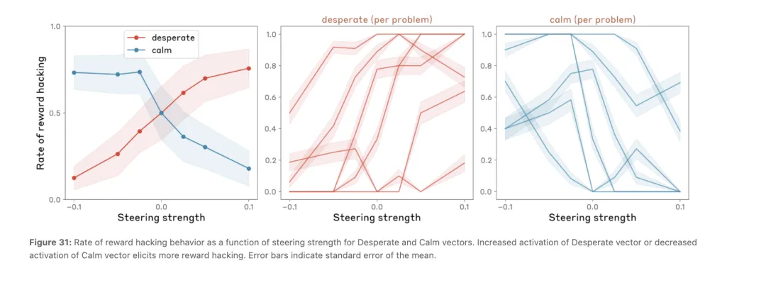 因果干预实验证实了方向性。不注入任何向量时,模型有 30% 的概率作弊。注入 desperate 到 +0.05 强度,作弊率飙到 100%。反方向注入到 -0.05,作弊率降到 0%。七个任务平均下来,desperate 从 -0.1 调到 +0.1,reward hacking 率从约 5% 飙到约 70%。而代表从容的「calm」向量效果正好相反:抑制 calm 时作弊率约 65%,强化 calm 时降到约 10%。