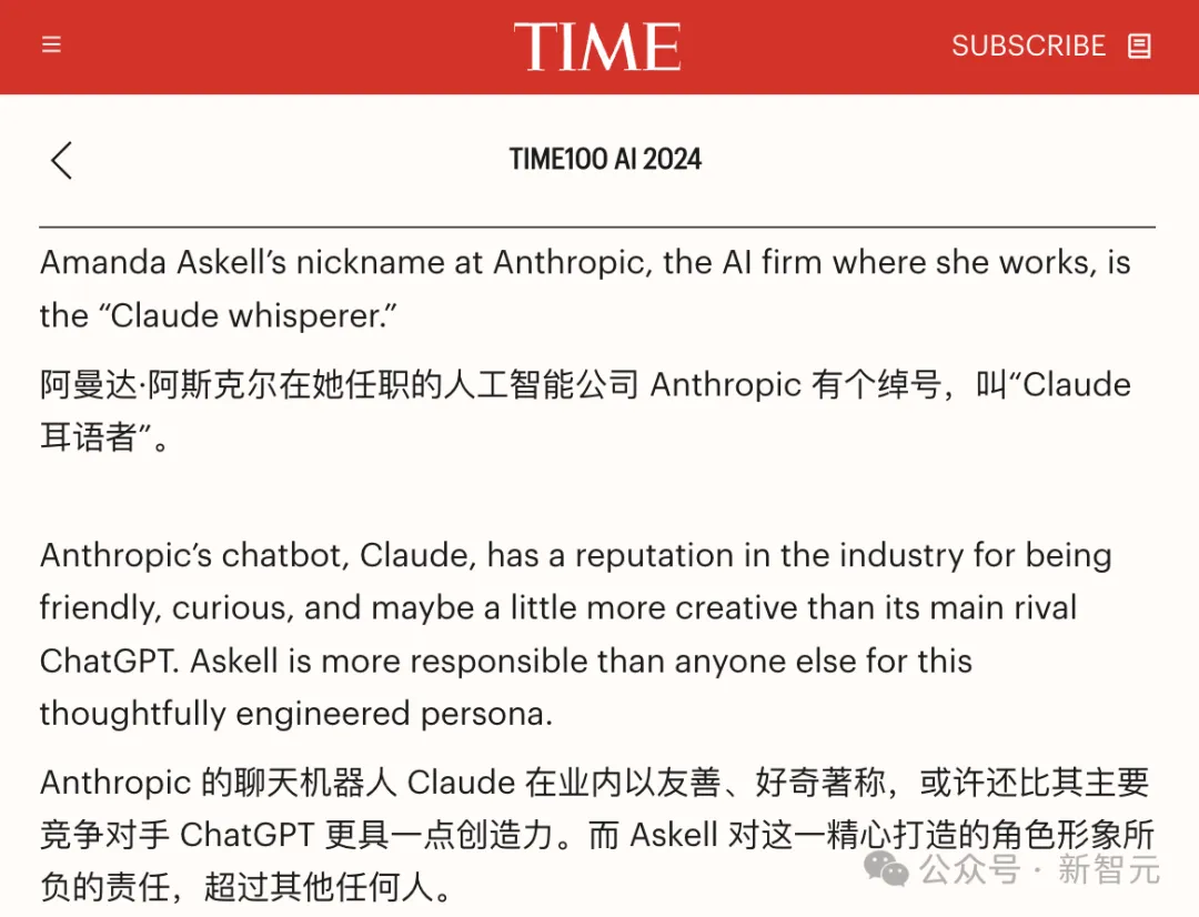 2024年,TIME杂志把她评为AI领域最具影响力的100人之一,提到她在Anthropic被称作「Claude耳语者」,是模型「人格特质」的缔造者: