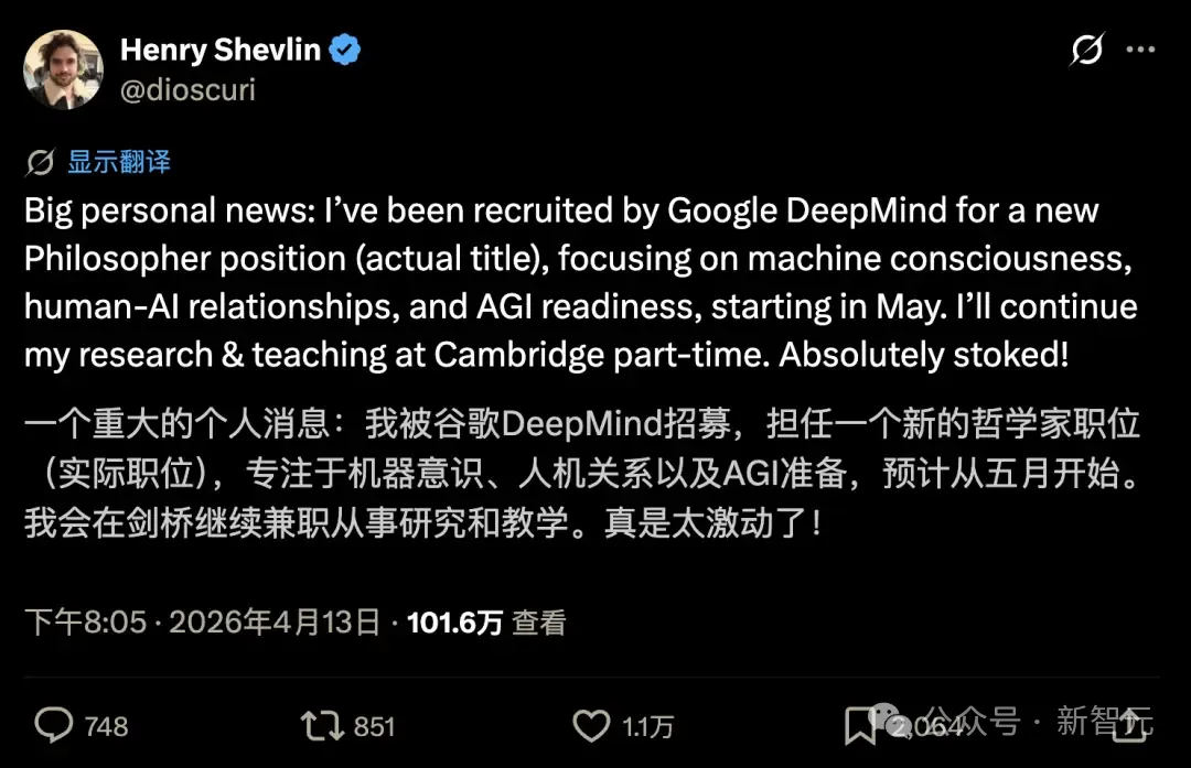 就在Clark发言的同一周,Google DeepMind宣布招了一位头衔就叫「Philosopher」的人:Henry Shevlin。