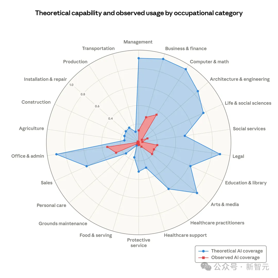 Anthropic劳动力报告核心图表:蓝色为AI理论覆盖率,红色为实际覆盖率。计算机与数学类94% vs 33%。